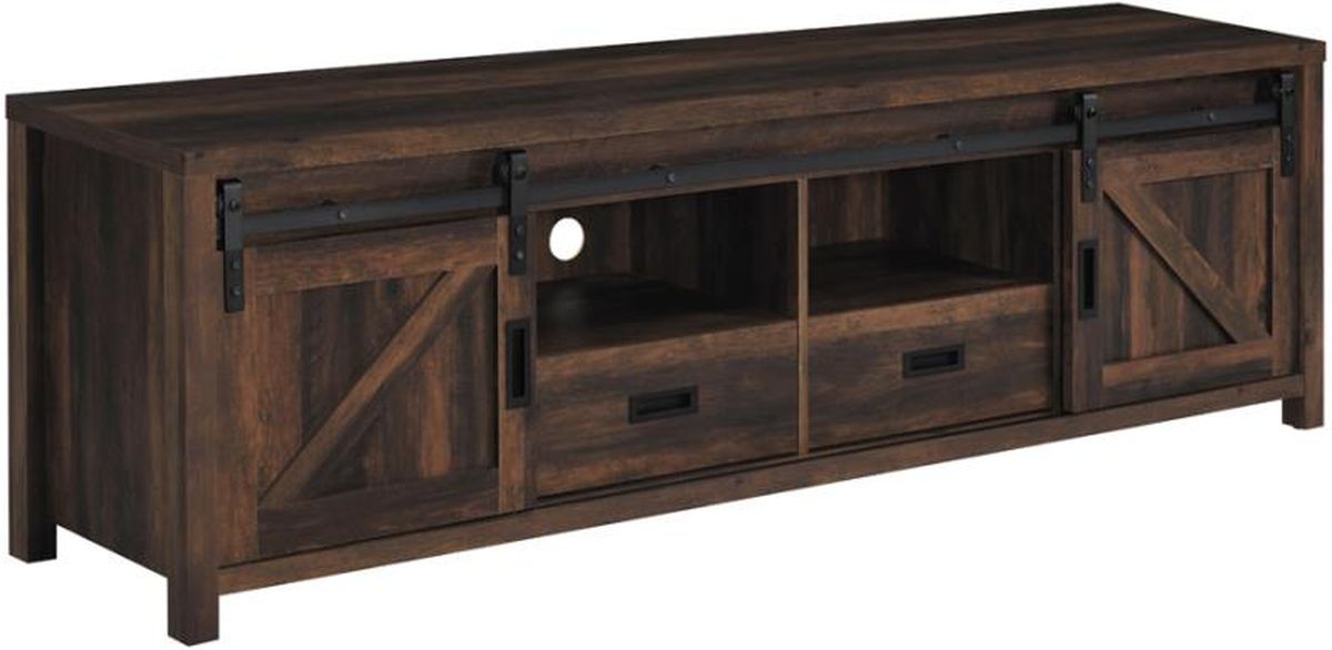 Wood-like finishes and country-inspired elements create this rustic style TV console. Keep entertainment consoles, a stereo and more tucked neatly within two open shelves toward the center. Disguised by sliding barn doors mounted on black hardware that lend an industrial touch.Read More