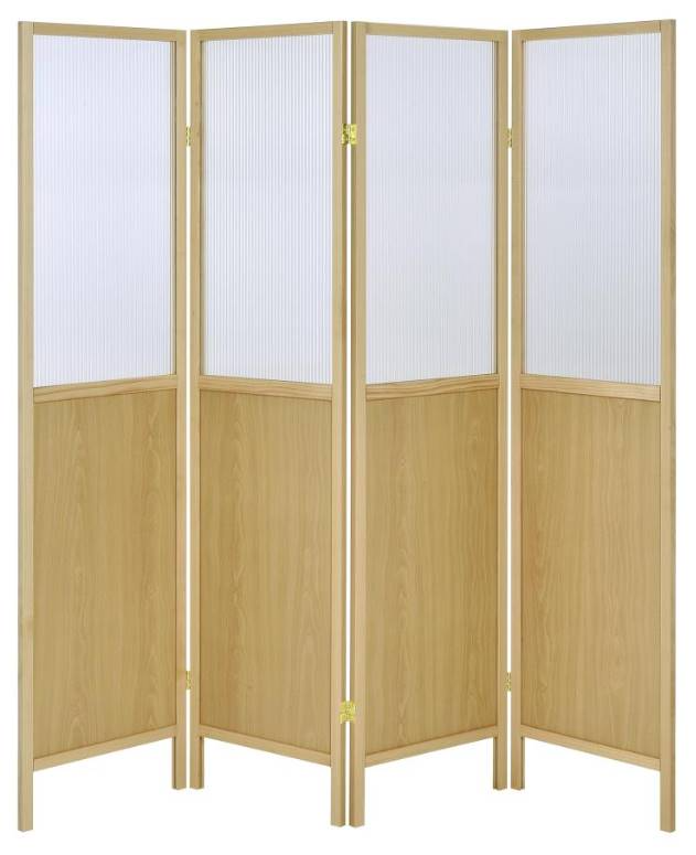 Create the perfect sense of division in your open living space with a transitional four-panel room divider. The freestanding piece offers four tall panels, each divided with a semi-opaque top section that allows light to pass through.Read More