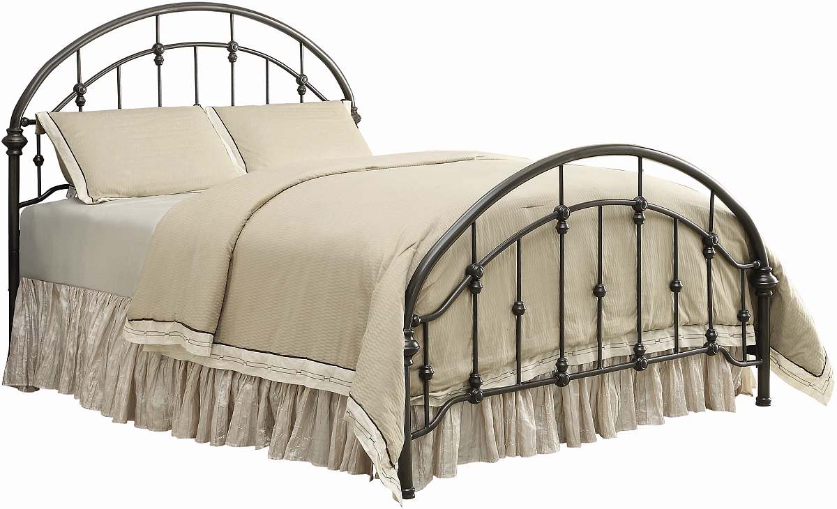 Complete a master bedroom with a decorative touch of glamour. This beautiful eastern king bed pulls a room together in style. Its arched headboard and footboard are adorned with intricate metal accents. A classic bronze finish adds a hint of subdued elegance. Top-quality metal craftsmanship rounds out its traditional appeal.