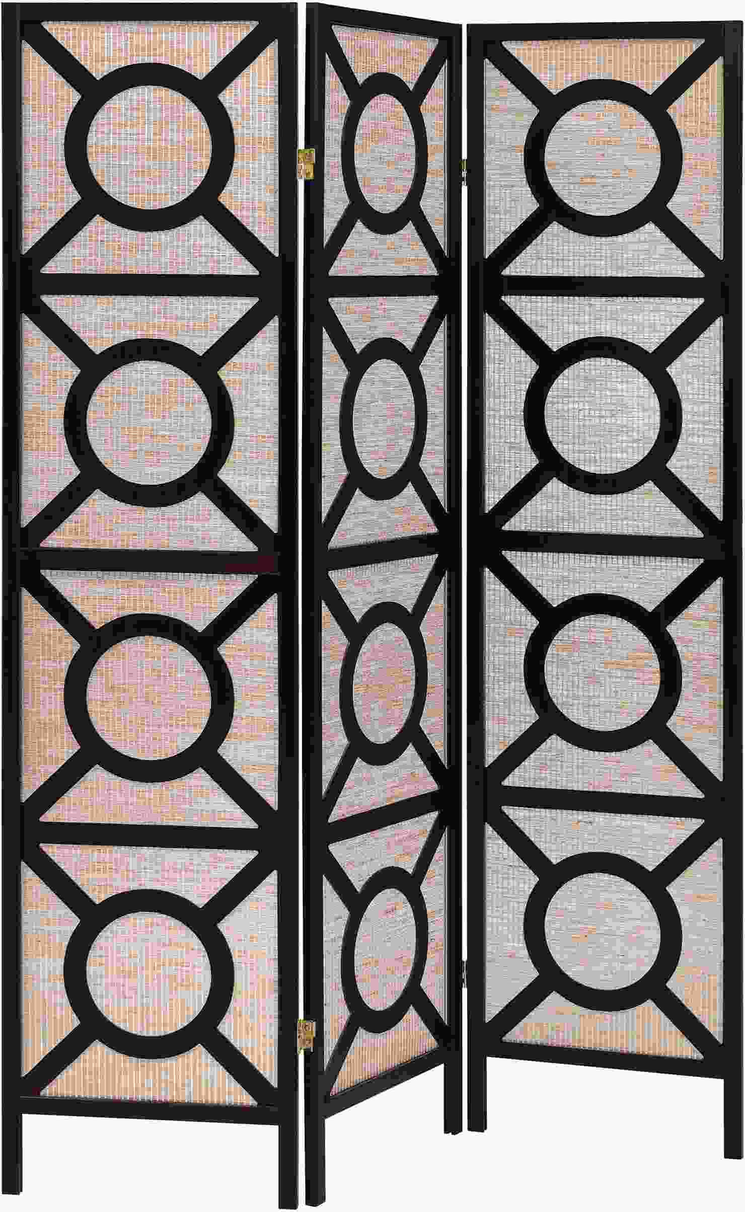 Contemporary three panel screen with geometric design over translucent fabric panels