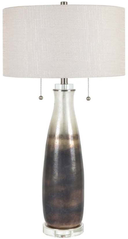 The pearlized glass is wrapped in bands of black, copper and gold giving a rich ombre effect to our Copeland double socket lamp with twin pulls. It is topped with a shallow white linen drum shade.Read More