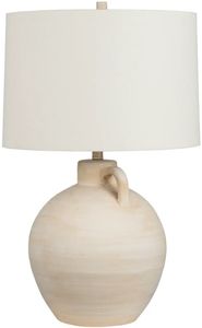 This charming table lamp features a ceramic jug-shaped body in a natural tan finish, showcasing a smooth, rustic texture with subtle handmade details. The organic curves and integrated handle give it a timeless, artisanal appeal. It is topped with an oatmeal linen tapered drum shade.Read More