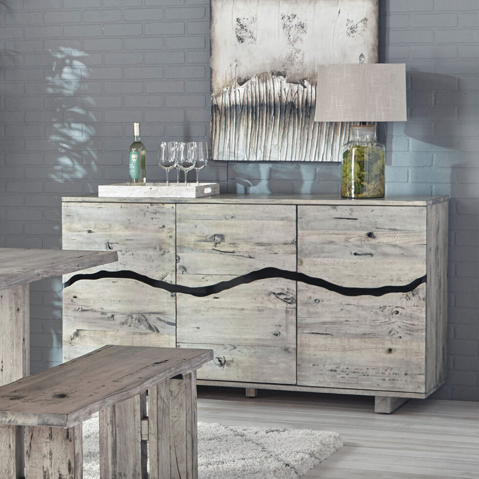 The Renewal buffet presents a light, weather-worn finish over reclaimed mahogany, mango, and mindi woods. With sturdy construction and a simple modern-rustic profile, it blends organic texture and practical home elegance.Read More