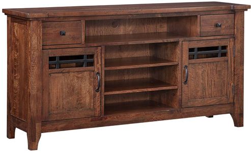 The Whistler Retreat 64" entertainment center showcases a rustic brown finish with rich wood grain details. It features open shelving and storage compartments, offering functionality and timeless style that complements cozy, nature-inspired living room spaces.Read More