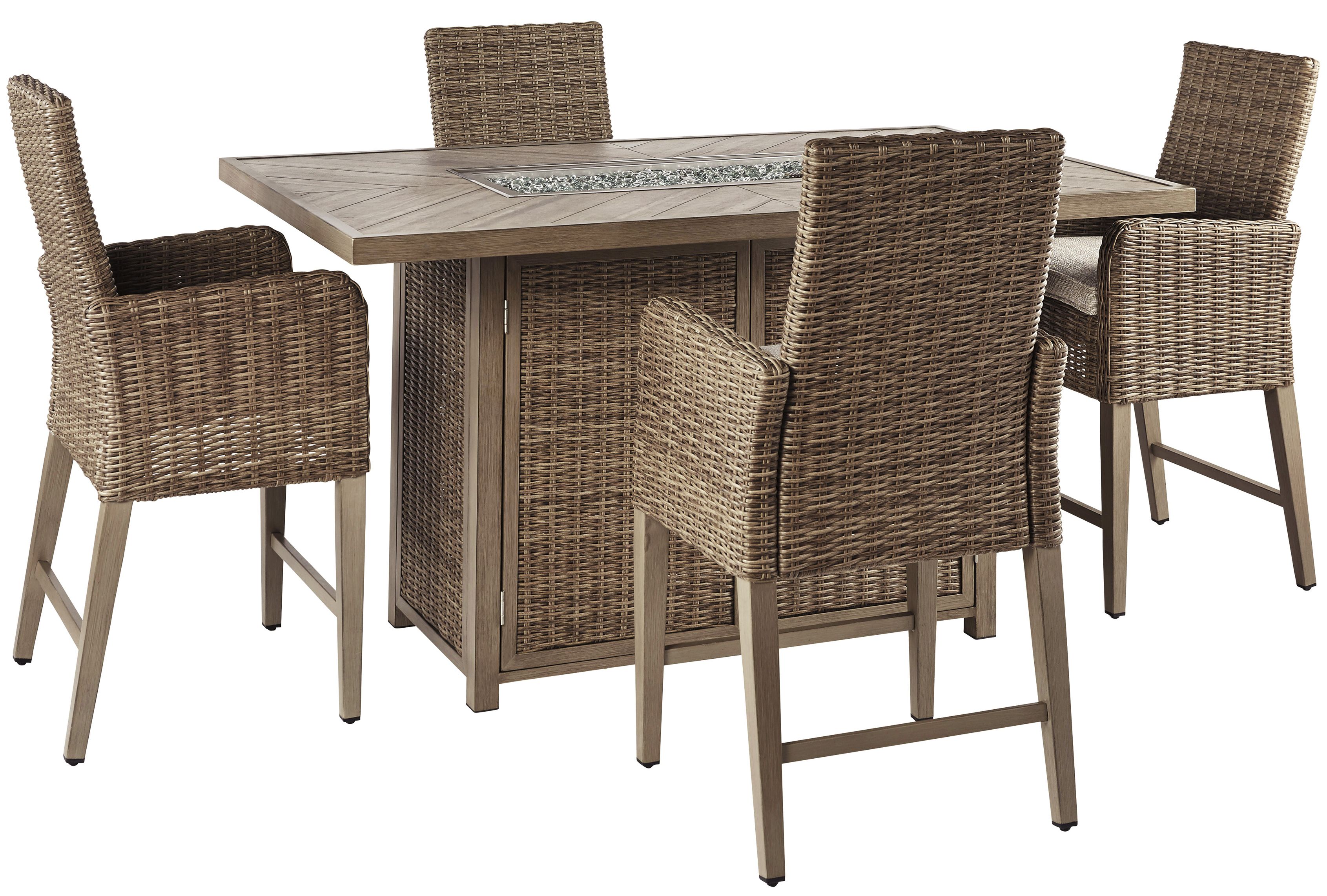 Turn your backyard into a hotspot for entertaining with this fire pit table. Sporting an easy-on-the-eyes look inspired by driftwood, this fire pit table elevates the art of al fresco living. Chic chevron-patterned porcelain top is paired with all-weather resin wicker over rust-proof aluminum for beauty and brawn. Stainless steel burner with glass beads adds a captivating element sure to wow.Read More