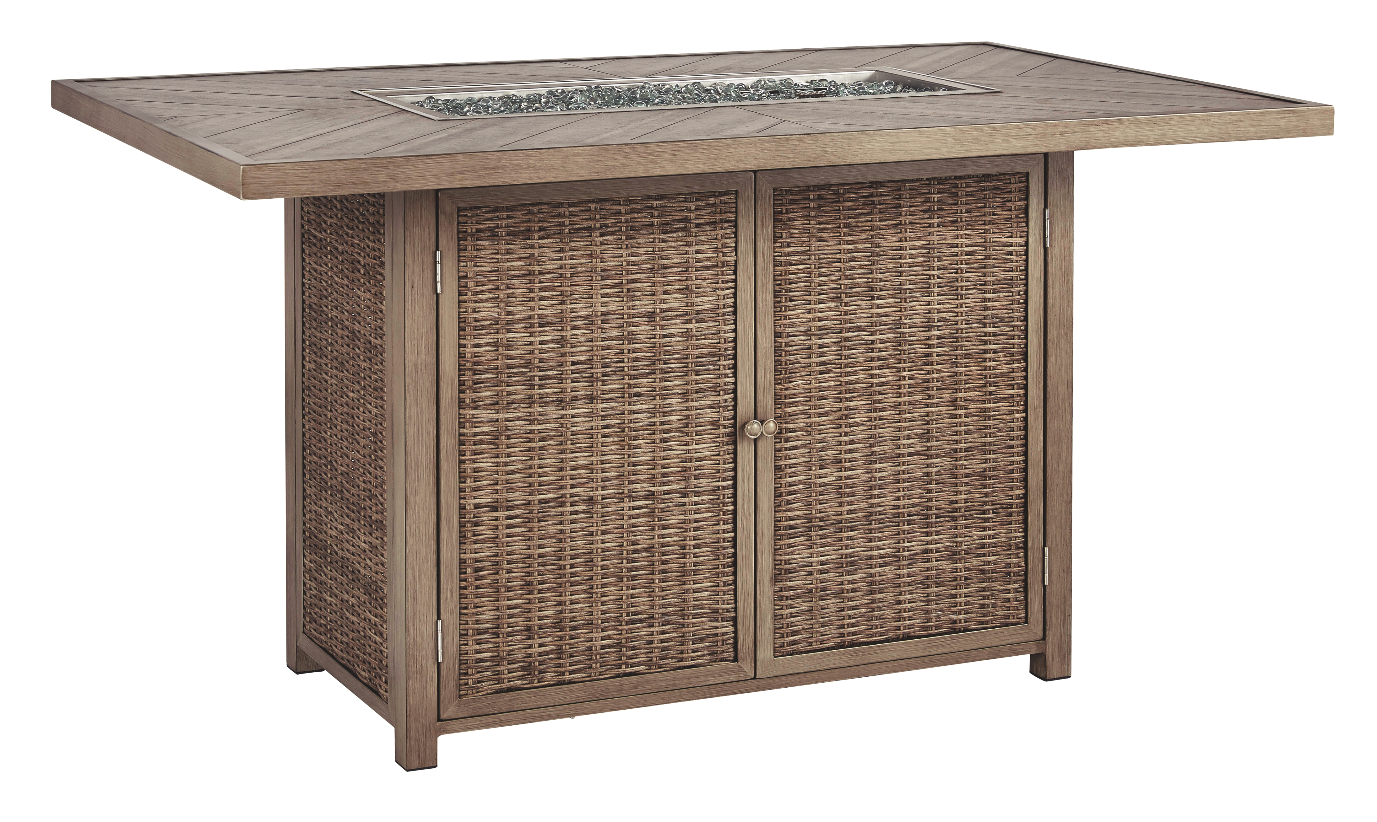 Turn your backyard into a hotspot for entertaining with this fire pit table. Sporting an easy-on-the-eyes look inspired by driftwood, this fire pit table elevates the art of alfresco living. Its chic chevron-patterned porcelain top is paired with all-weather resin wicker over rust-proof aluminum for beauty and brawn. A stainless steel burner with glass beads adds a captivating element sure to wow.Read More