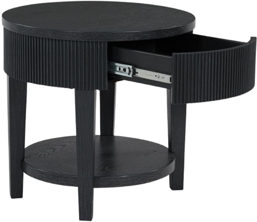 Classic and cool in dark charcoal, this end table brings contemporary convenience to your living room. Short on storage? The trendy reeded apron conceals a drawer perfect for remotes, controllers and other entertainment accessories. What a perfect marriage of style and functionality.Read More