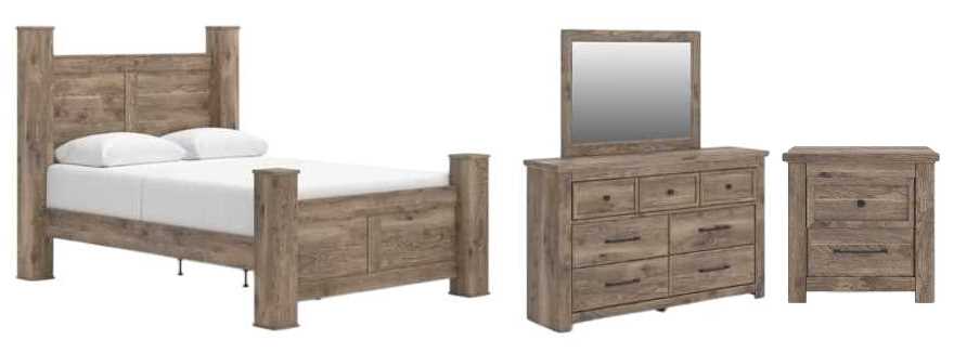 Set includes poster bed, dresser, mirror and nightstand.