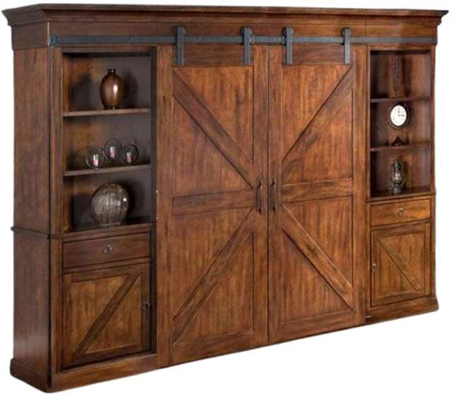 The Santa Fe entertainment wall is the choice for any living room or family room. Its beautiful Dark Chocolate finish goes with most traditional decor. The barn door hardware is designed to effortlessly open and close the unit for effortless access to stored items.Read More