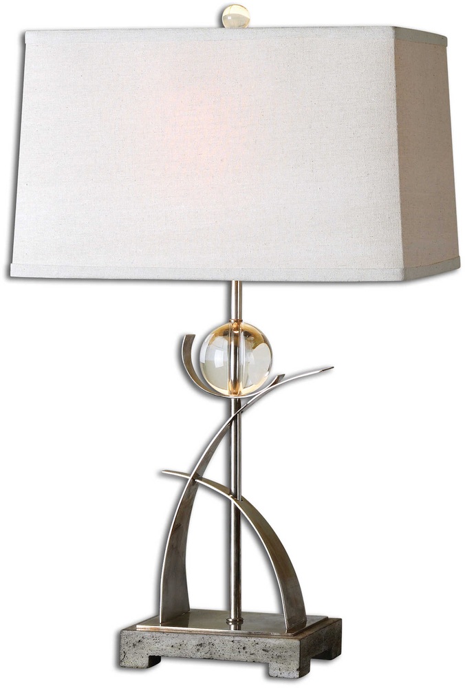 Thick curved metal finished in lightly antiqued silver accented with crystal details and a burnished concrete foot. The rectangle, slightly tapered hardback shade is a beige linen fabric with natural slubbing.